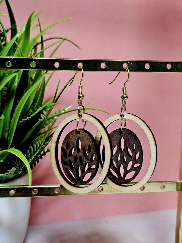 Laissez-vous séduire par cette paire de boucles d’oreilles au charme bohème et à l’élégance automnale. Conçues avec finesse, elles mesurent 5 cm de hauteur et 3 cm de largeur, offrant une présence délicate mais affirmée. Chaque boucle est composée de deux cercles concentriques : un anneau extérieur en matériau clair qui évoque la douceur des bois pâles, et un motif intérieur sombre finement découpé au laser, représentant une feuille stylisée aux découpes symétriques, comme sculptée par la nature elle-même.
